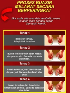 Kalau nak tahu, berak berdarah adalah tahap 1 buasir. Biasanya bila berak berdarah, di dalam dubur sudah terbentuk benjolan kecil, tapi masih belum keluar lagi.
